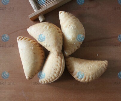 面粉用沸水燙成熟面,與糯米粉揉勻成粉團(tuán),搓條,摘?jiǎng)?,掀成皮子。將?xì)豆沙餡,豬板油丁和糖分別包入皮子,對(duì)折成半月形餃子,放入油鍋,炸至金黃色撈起。
