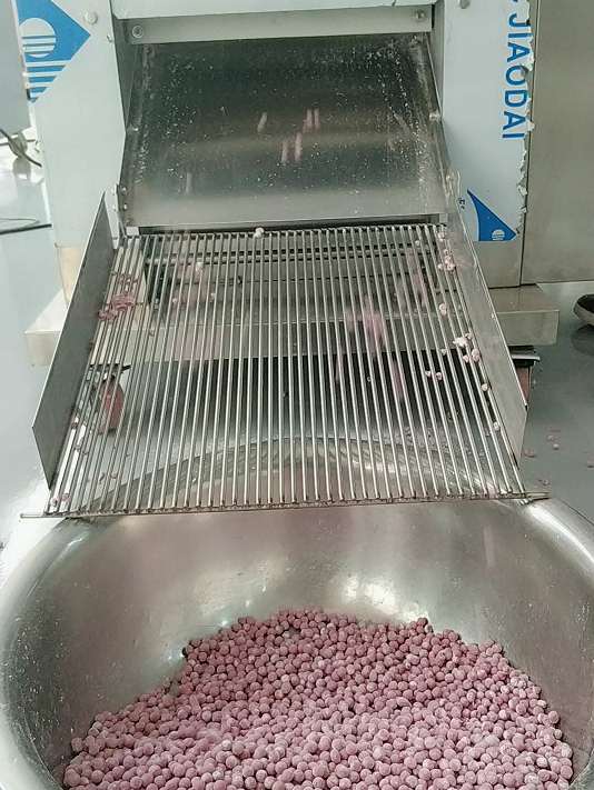 合成的面團(tuán)可通過旭眾無餡湯圓機(jī)分割搓圓成一個(gè)個(gè)小丸子,一小時(shí)可生產(chǎn)0~120kg,規(guī)格6-22mm可定制(注:一臺(tái)機(jī)器只有一種規(guī)格,所以一定要確定好自己要的規(guī)格)