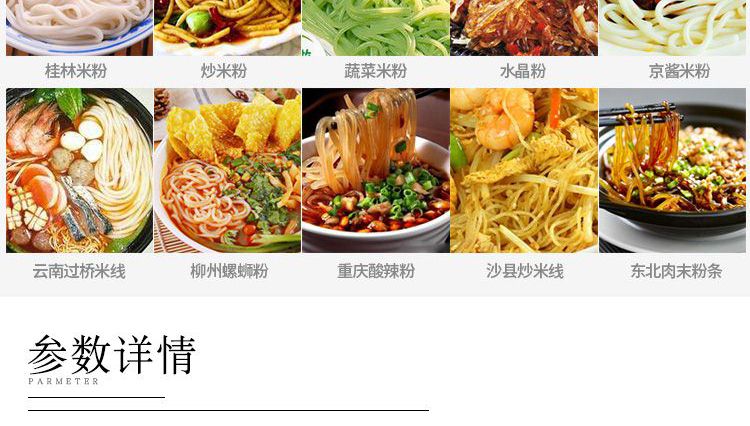 ◆ 米粉機(jī)生產(chǎn)多樣性可生產(chǎn)米粉、米線、粉絲、粉條、年糕、玉米面條、各種雜糧粉絲、各種面條、雜糧面條、彩色面條以及以紅薯、玉米、大豆、蠶豆等制成淀粉為原料的等多種食品而且每種食品厚薄、粗細(xì)等規(guī)格可根據(jù)需要任意調(diào)整。