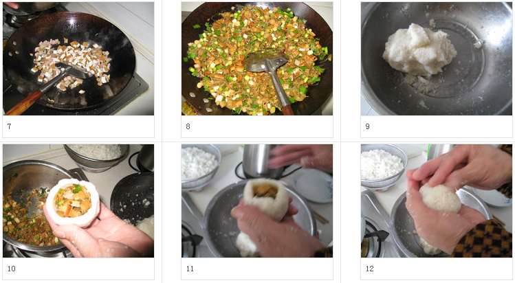 11.慢慢把口捏攏。這個(gè)不比面團(tuán),沒(méi)有彈性,故只能不斷的把米團(tuán)往上推,最后合上口。如果感覺(jué)比較粘,可以放一邊沾水處理。