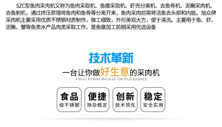 旭眾XZC系類魚肉采肉機(jī)是一款專業(yè)加工魚肉去刺、蟹蝦去殼的機(jī)械,由于隨著市場(chǎng)的發(fā)展,人們生活中漸漸離不開有魚的生活,無(wú)論是家里、飯店等魚都是主要的食物還有現(xiàn)在一些休閑食品中都是離不開魚加工后的魚泥。魚肉采肉機(jī)的研制成功給人們生活中帶來(lái)很多方便,無(wú)論是您做魚丸、魚餡等只需要一款魚肉采肉機(jī)就可以實(shí)現(xiàn),對(duì)于大量生產(chǎn)即降低了人工成本,又提高了生產(chǎn)效率。